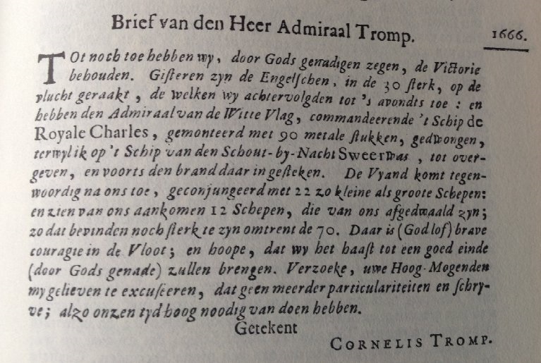 Gisteren hebben wij den dans aangegaen, en ben, Godt sy gelooft, gesond, en hebben ons herte eens weder opghehaelt als keuningen. Ick ben op myn vierde Schip, ‘de Komeetstar,’ en meene vandaeg een braven dans te dansen. Wij krijgen de Franschen so aen 't loopen, dat zij bramzeyls en alles byzetten; en so het vandaeg so voortgaet, so hope ick, dat aller Vrienden en ons gebed verhoort sal zijn, en dat wij van de tirannye verlost zullen worden. Adieu! Couragie! `t sal waerachtig wel gaen.
